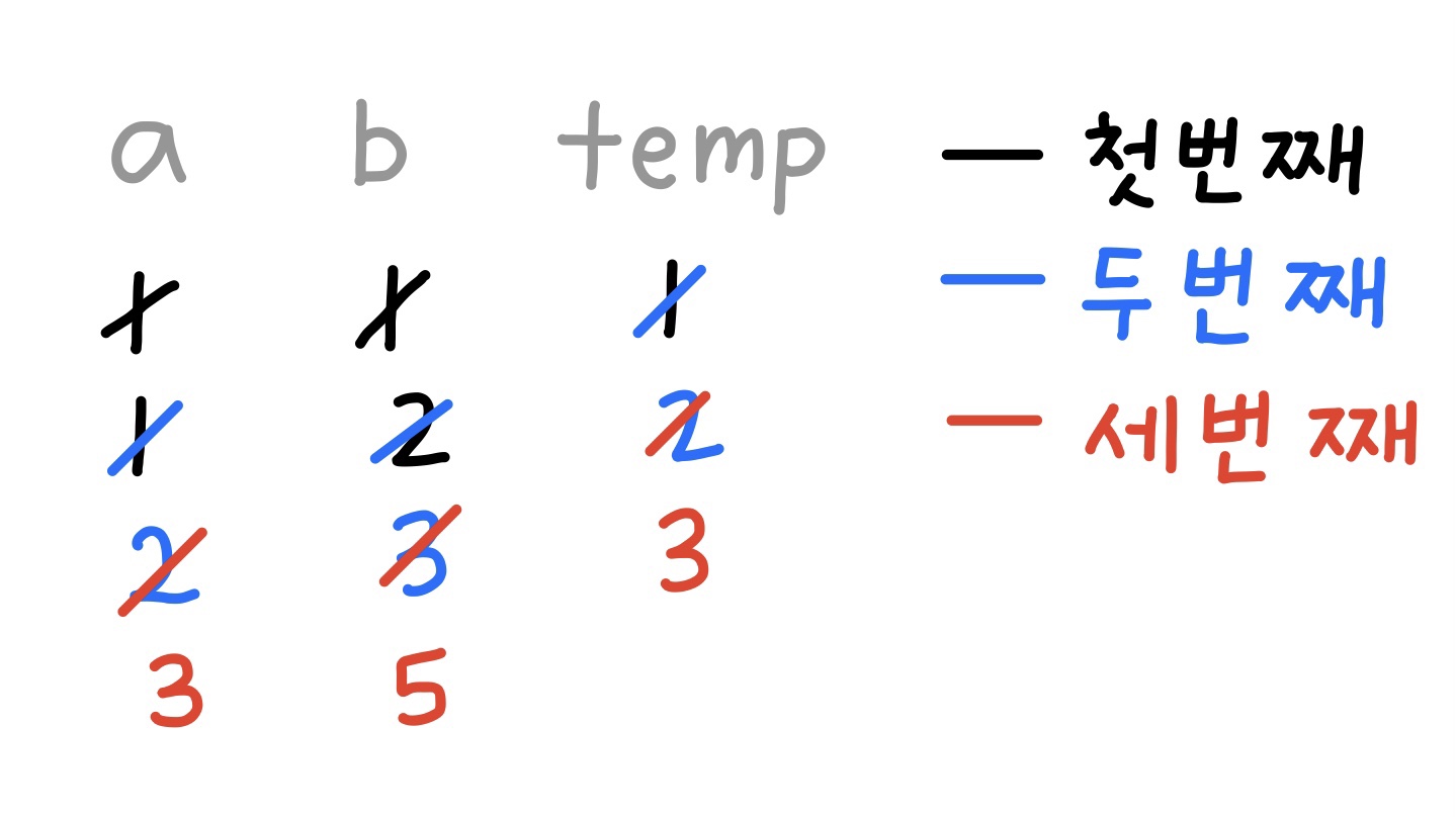 또, fib()함수에서는 기존의 계산된 두 수 a,b와 임시 변수 temp 를 사용하여